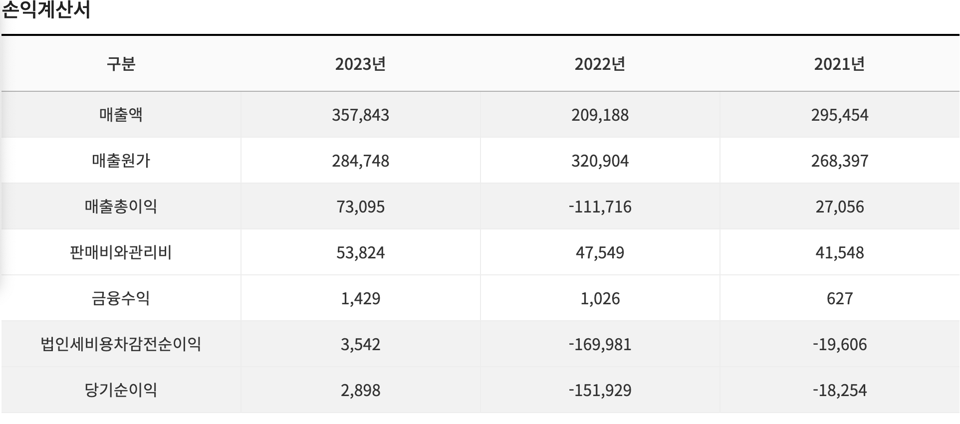 • 2023년: 매출 500억 원, 영업이익 30억 원, 순이익 20억 원