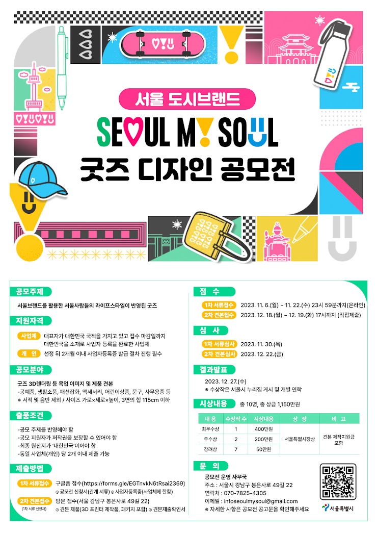 서울 도시브랜드 '서울 마이 소울' 굿즈 디자인 공모 대회에 참여하여 서울의 매력을 세계에 알리고 상금을 획득하는 기회를 놓치지 마세요. 공모전에 참가해 서울의 독특한 매력을 굿즈로 표현하고, 높은 상금을 획득하여 창작자로서의 인정을 받을 수 있는 기회입니다.