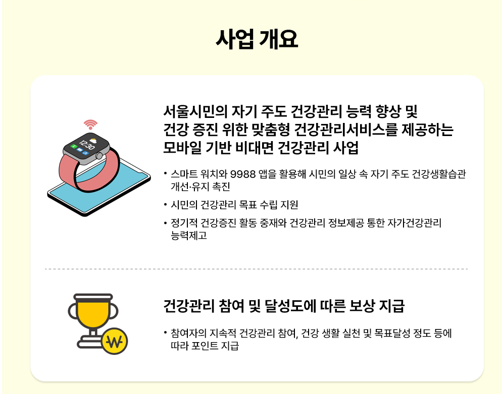 안녕하세요. 오늘은 서울시의 스마트 헬스케어 사업인 '손목닥터 9988'에 대해 포스팅을 하려고 합니다. 서울에 거주하시는 시민 여러분에게 건강과 알뜰함을 챙길 수 있는 내용이 될 것 같습니다.