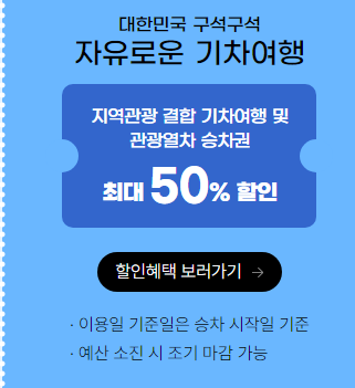 관광열차 할인 : 관광열차 5개 노선 대상 승차권 할인(주중 및 주말 최대 50% 할인) *서해금빛열차, 남도해양열차, 동해산타열차, 정선아리랑열차, 백두대간협곡열차