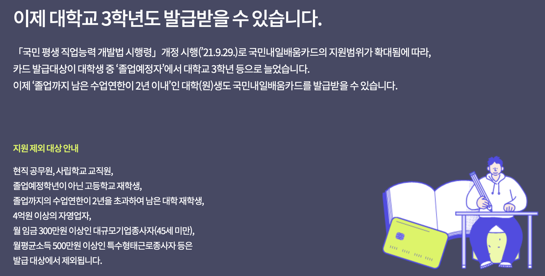 구직자는 물론 재직자, 실업자, 특수형태근로자, 자영업 종사자 등 국민 누구나 해당됩니다. 지원 범위가 확대되어 대학교 3학년 생부터도 혜택을 받을 수 있습니다.