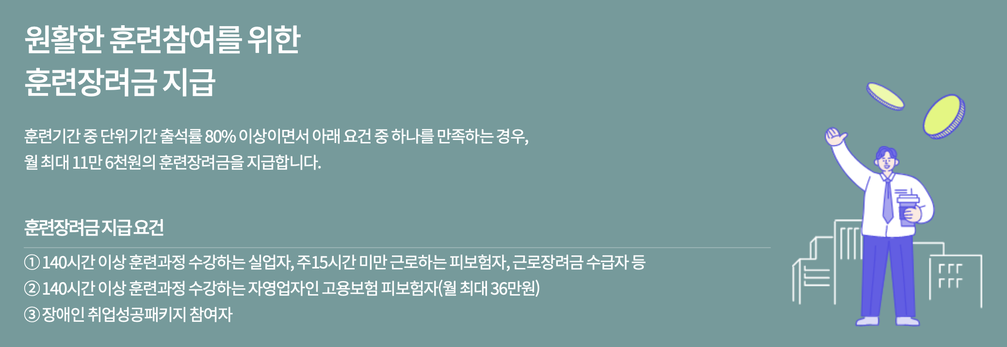 국민내일배움카드로 140시간 이상의 훈련 과정을 수강하는 교육생에게는 교통비와 식비 명목으로 훈련장려금도 추가로 지급합니다. 1일 훈련시간 5시간 미만 과정은 1일 지원액 2,500원에 식비 3,300원을 더해 1개월 출석율을 채우면 월 최대 11만 6천 원을 지원받을 수 있습니다.