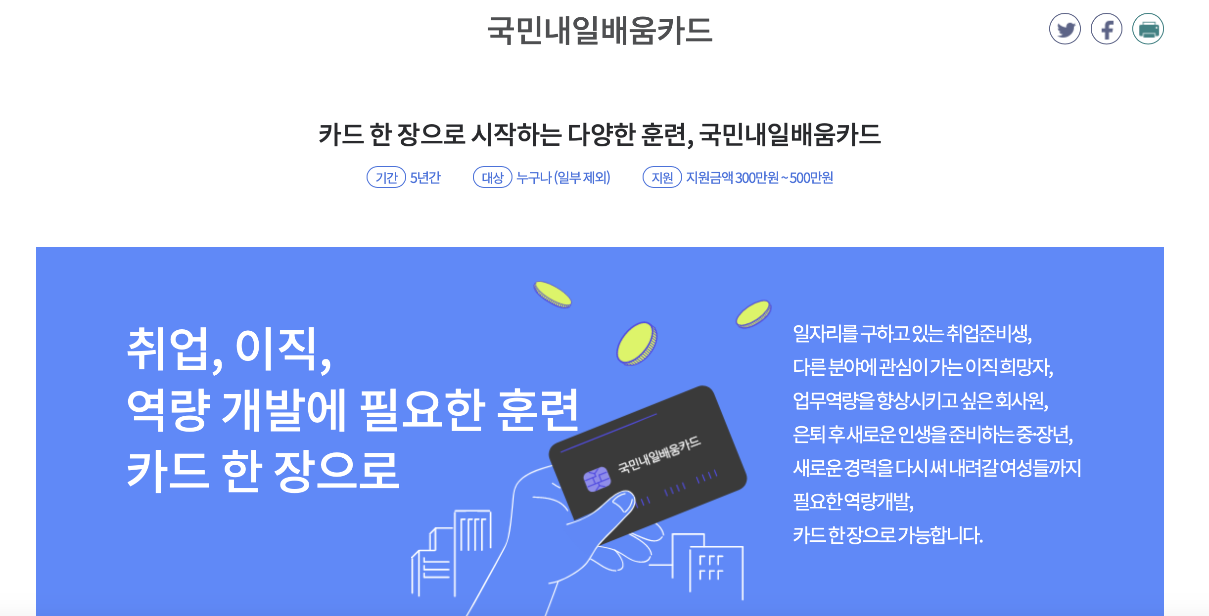 청년부터 구직자, 재직자 등이 자기 계발을 할 수 있도록 나라에서 직무 관련 훈련비용 등을 지원해 주는 국가사업입니다. 300만 원을 기본으로 지급하며, 최대 500만 원까지 지원받을 수 있습니다.